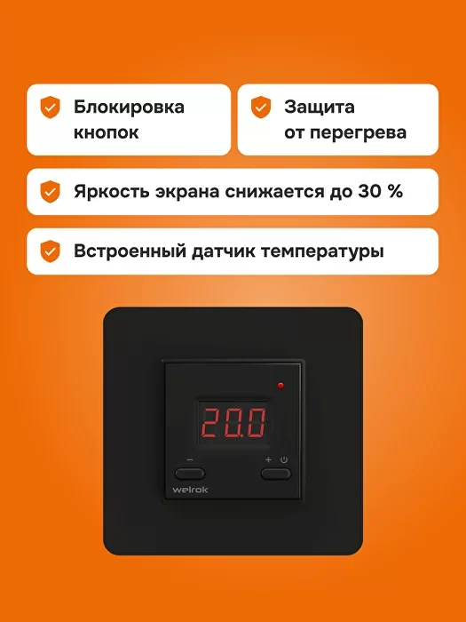 Терморегулятор для обогревателей Welrok vt bk atl соответствует всем заявленным характеристикам и поставляется с официальной гарантией.